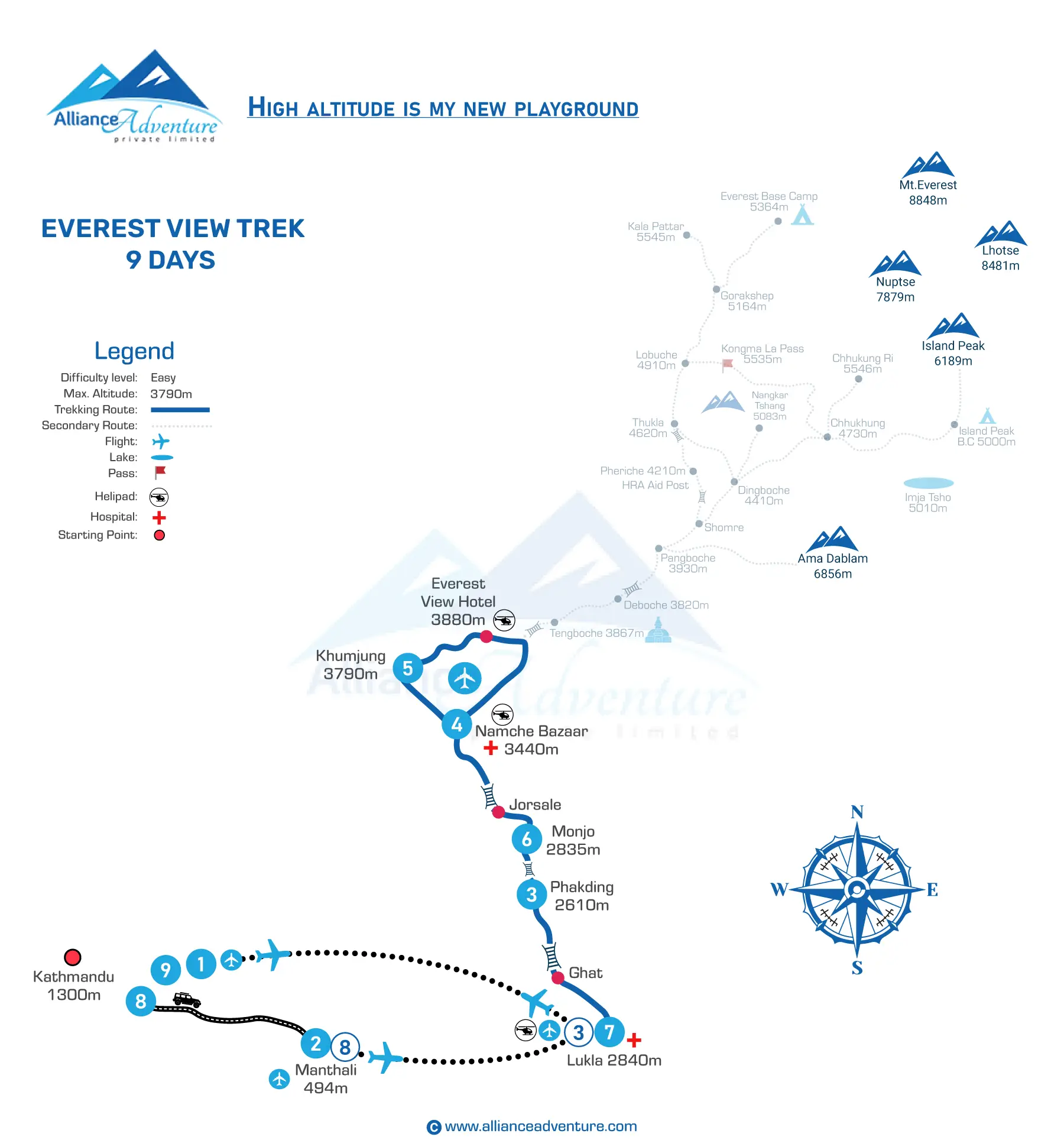| 5 | Trek | Namche Bazaar – Everest View Hotel - Khumjung Village | 3790 | 4 Hours | Guest House | Breakfast-Lunch-Dinner |